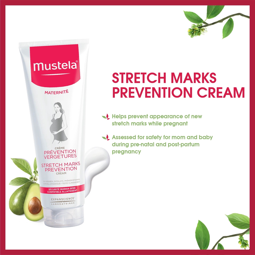 Gif. Specially formulated for expectant and new mothers, stretch marks prevention cream helps prevent stretch marks thanks to its unique combination of active galactoarabinan, a patented stretch mark care ingredient extracted from the larch tree, promotes elasticity, keeps skin supple and helps it to wit. Mustela's stretch marks prevention cream is proven safe and effective for expecting mothers and is 100% safe for everyday use while breastfeeding.